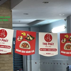 b/ Sản xuất Cờ dây nhựa (Bunting): in trực tiếp trên nhựa PP dày từ 0.2mm đến 0.8mm, bế (die cut) gia nhiệt, Hàn siêu âm.