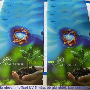 Bìa sơ mi lá (bìa lá); bìa sơ mi nút (bìa nút), bìa túi sơ mi, folder nhựa, in hình ảnh nhiều màu, sắc nét, bằng phương pháp in công nghiệp hiện đại, In offset UV, in trực tiếp lên tấm nhựa PP, sau đó Cắt, Bế (die cut) gia nhiệt, hàn siêu âm, hàn túi gắn name card, đóng nút nhựa âm – dương, trên máy đóng nút tự động.