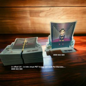 Sản xuất Standee nhựa, PET Standee, Thẻ nhựa PET trong suốt, Thẻ nhựa PET trong suốt có ghép màng bảo vệ (màng từ tính, màng chống trầy): in offset UV trực tiếp trên nhựa PP, PVC, PET, PS dày từ 0.2mm đến 0.8mm, bế (die cut) nhiệt