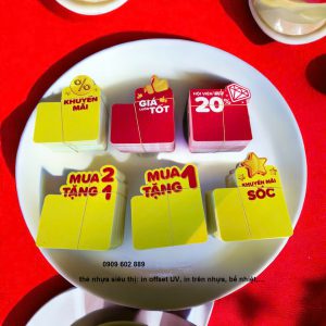 1/ In offset UV – in offset trên nhựa PP (PS, PVC, PET, giấy nhựa tổng hợp – Synthetic Papper) sản xuất Vật phẩm quảng cáo: Dangler nhựa, hanger nhựa. In offset UV, in 4 màu CMYK, in 2 mặt, bế gia nhiệt.