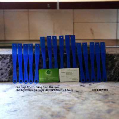 - Cán quạt – Loại đinh tán reve, loại này cao 17 cm, dùng được cho lá quạt dày, lá quạt có kích thước lớn. Cán quạt đinh tán reve kẹp vào lá quạt và cố định bằng đinh tán reve, nên rất chắc chắn, cứng cáp, bền bỉ. Cán quạt đinh tán reve cũng là cán quạt chất lương cao cấp, bền đẹp.