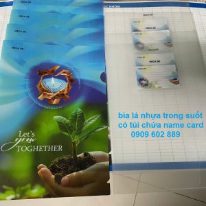 Bìa sơ mi lá (bìa lá); bìa sơ mi nút (bìa nút), bìa túi sơ mi, folder nhựa, in hình ảnh nhiều màu, sắc nét, bằng phương pháp in công nghiệp hiện đại, In offset UV, in trực tiếp lên tấm nhựa PP, sau đó Cắt, Bế (die cut) gia nhiệt, hàn siêu âm, hàn túi gắn name card, đóng nút nhựa âm – dương, trên máy đóng nút tự động.
